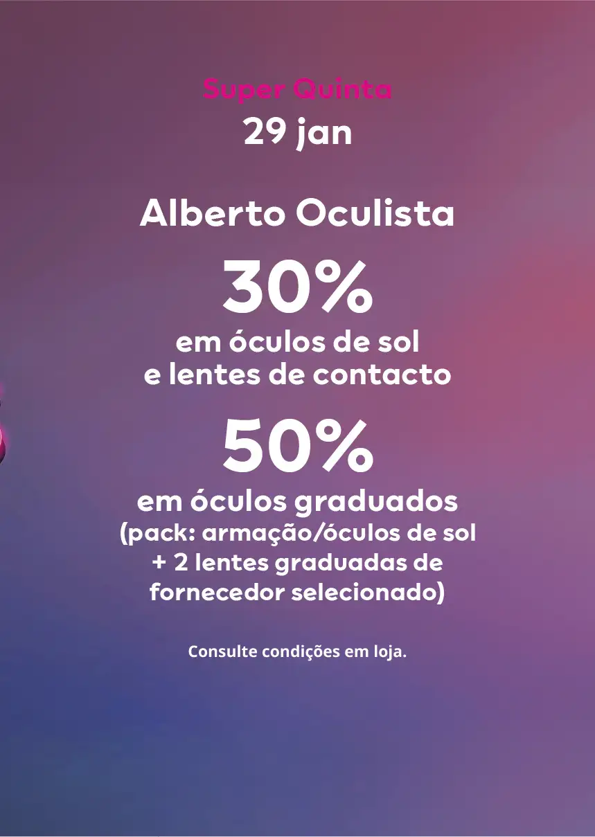 Cannot be combined with current partnerships, protocols or other campaigns/discounts. Exclusive to the Alberto Oculista store at MAR Shopping Algarve.