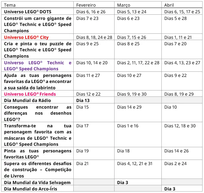 Programação trimestral da LEGO® Fan Factory